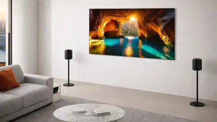 Вторая важная деталь — отсутствие видимых кабелей. Все подключения вынесены во внешний блок Zero Connect Box. В него подключаются источники сигнала, включая приставки, игровые консоли и другие устройства, а затем изображение и звук передаются на телевизор по беспроводной связи. Профильные СМИ сообщают, что блок можно разместить примерно на расстоянии до 10 метров от экрана. На самой панели обычно остаётся только питание.