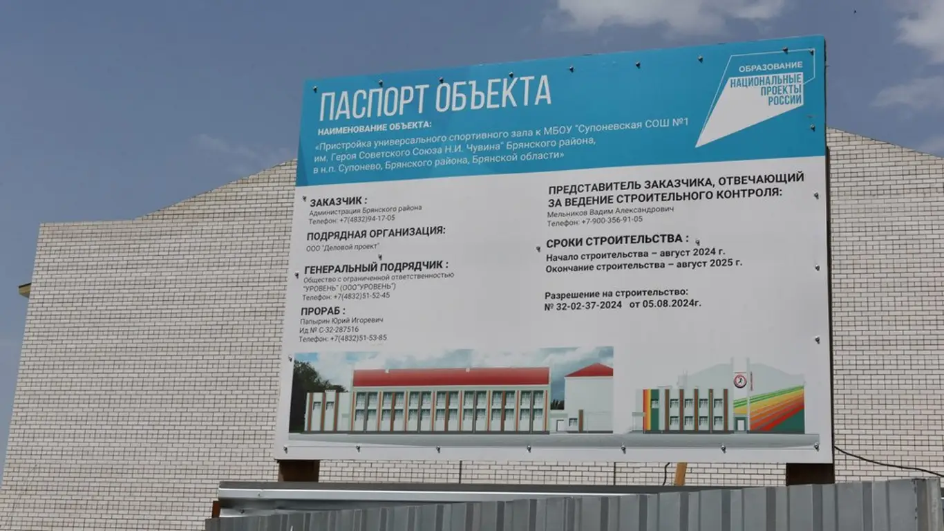 Во время рабочей поездки по региону губернатор Брянской области Александр Богомаз посетил строящийся спортивный объект — универсальный спортзал при Супоневской школе №1 имени Героя Советского Союза Н.И. Чувина.На данный момент здание полностью возведено. Строители выполняют внутреннюю отделку, прокладывают инженерные коммуникации. Следующим этапом станет благоустройство прилегающей территории.Объект планируется сдать к началу нового учебного года. Спортзал будет доступен не только для учащихся школы, но и для жителей населённого пункта. Здесь можно будет заниматься баскетболом, волейболом и мини-футболом.