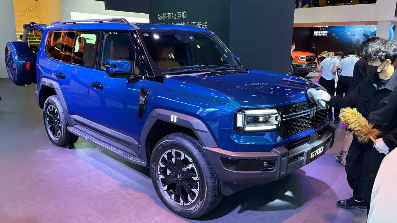 Внешне G700 напоминает классические внедорожники: чёткие линии, плоская крыша и наружное запасное колесо. Размеры впечатляют: длина — до 5198 мм, ширина — 2050 мм, высота — около 1956 мм. Пневмоподвеска регулирует клиренс от 150 до 320 мм, углы въезда и съезда — 30° и 25°, а значит, это настоящий покоритель бездорожья.
