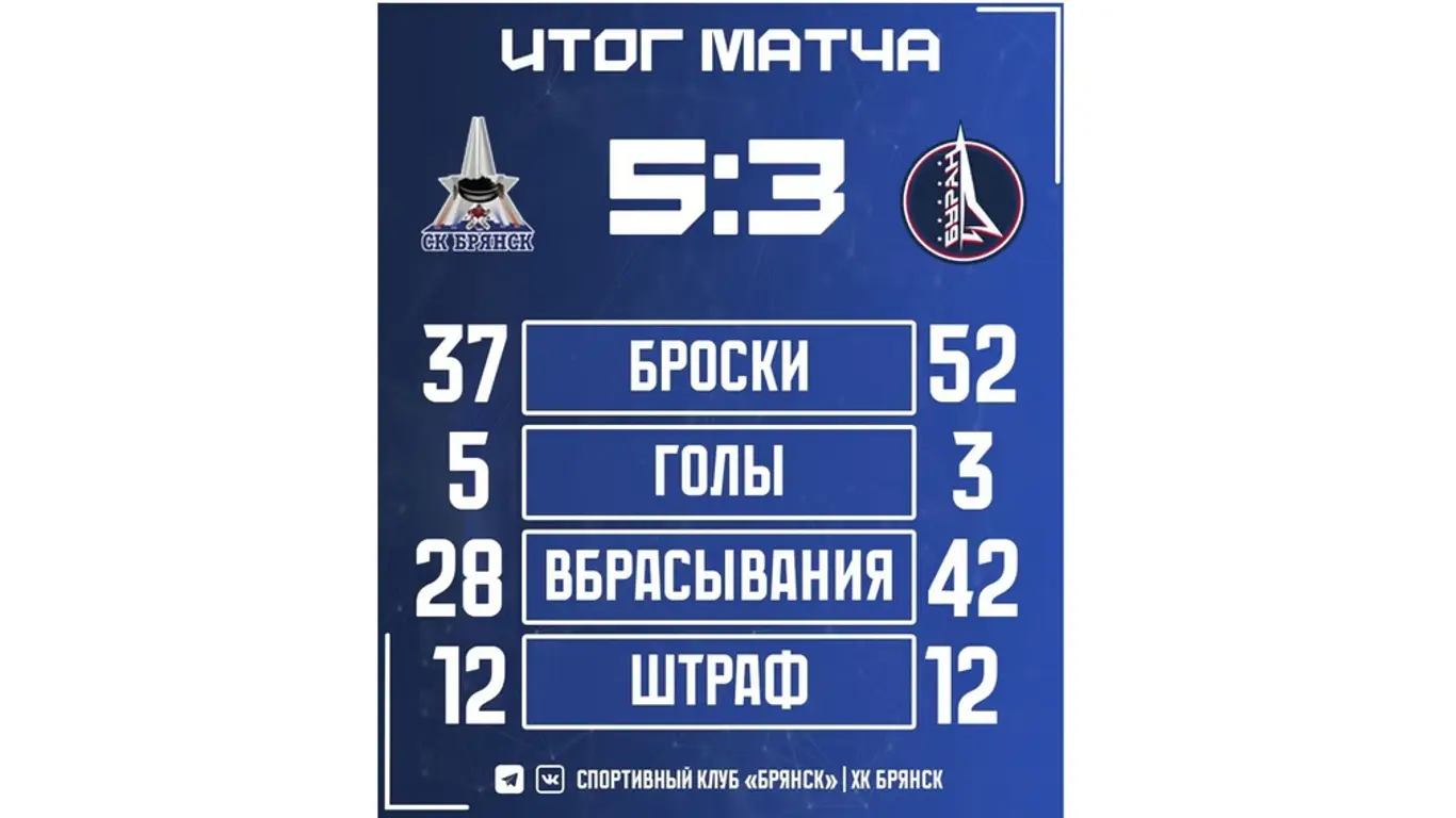 Хоккейный клуб «Брянск» одержал эффектную победу над московским «Бураном», завершив матч со счётом 5:3.С первых минут встречи брянцы задали высокий темп и продемонстрировали уверенную игру в атаке. Первый период полностью остался за хозяевами льда — две безответные шайбы обеспечили команде комфортное преимущество.Во втором периоде москвичи смогли навязать борьбу и сравнять счёт — к концу сорока минут на табло горели цифры 2:2. Однако в решающем отрезке встречи брянцы проявили характер и волю к победе, забросив ещё три шайбы и поставив уверенную точку в противостоянии.Эта победа стала отличным примером сплочённости, настойчивости и силы духа молодой брянской команды, которая уверенно продолжает сезон.