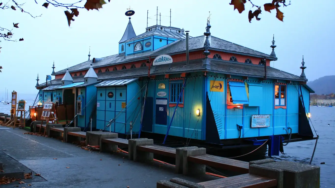 Когда в Цюрих приходит холод, на озере появляется деревянный корабль со светящимися окнами — Herzbaracke, камерный театр, который каждую зиму превращает набережную Bellevue в уютный островок света. Внутри всего около сорока мест, деревянные стены, мягкий свет, старинные игрушки и орган создают атмосферу салона из другой эпохи. Подробнее о зимней сказке Цюриха, которая существует на самом деле, можно узнать на сайте Туристас.