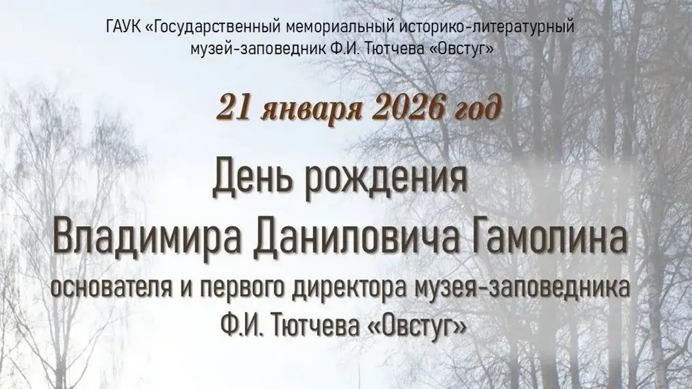 21 января в 10:00 в доме-музее Фёдора Тютчева «Овстуг» состоятся памятные мероприятия, приуроченные к 96-летию со дня рождения Владимира Даниловича Гамолина — основателя и первого директора музея-заповедника.В музее отметили, что жизненный путь Владимира Гамолина был тесно связан с сохранением культурного наследия Брянщины. Его деятельность сыграла важную роль в развитии музейного дела и в формировании бережного отношения к исторической памяти и литературному наследию региона.В день его рождения в Овстуге соберутся друзья, родственники, коллеги, соратники и односельчане, чтобы почтить память человека, стоявшего у истоков создания музея-заповедника.Программа мероприятий начнётся с литии в храме Успения Пресвятой Богородицы, после чего состоится возложение цветов на могилу Владимира Гамолина. Завершит памятный день литературная гостиная в школе имени М. Ф. Бирилёвой, посвящённая его трудам и вкладу в культурную жизнь региона. Организаторы приглашают жителей и гостей области принять участие в мероприятиях. Возрастное ограничение — 12+.