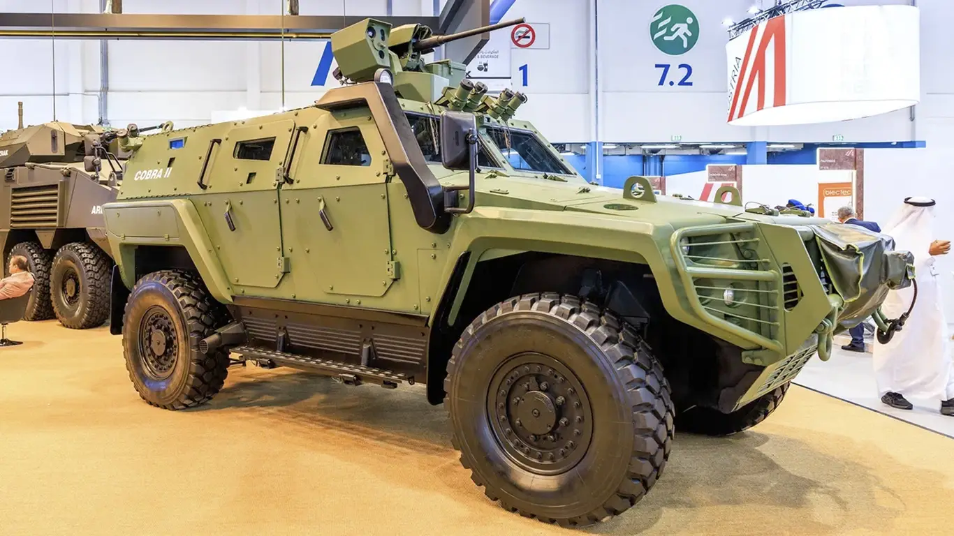 Как пишет издание «Военное дело», одной из ключевых моделей на стенде стал бронеавтомобиль Cobra II, который является развитием предыдущей версии — Cobra I. Этот колесный бронетранспортер с компоновкой 4x4 способен перевозить до десяти человек, включая экипаж, и обладает высоким уровнем защиты от мин и самодельных взрывных устройств. Конструкция машины модульная, что позволяет адаптировать её под различные задачи.